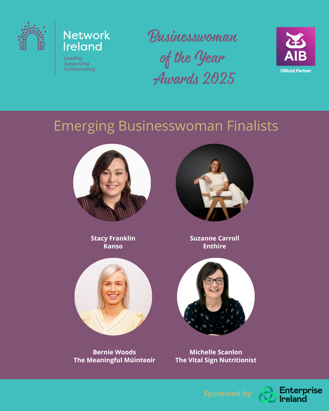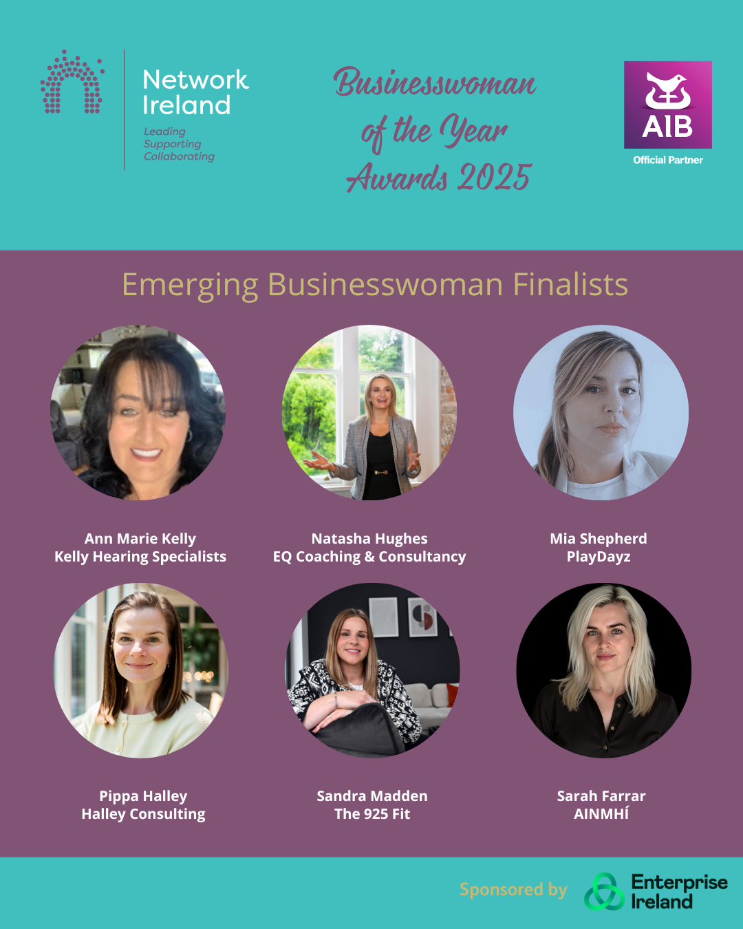 Emerging BusinesswomanSponsored by Enterprise IrelandThis category is open to professional Women who have started trading in their first business. The business entity can operate as a sole trader/partnership or limited company which is less than 3 years old. This category is designed to recognise the challenges and highlight the achievements that these women have encountered establishing a new business. Our 2025 Finalists