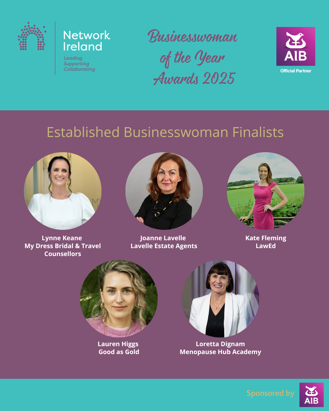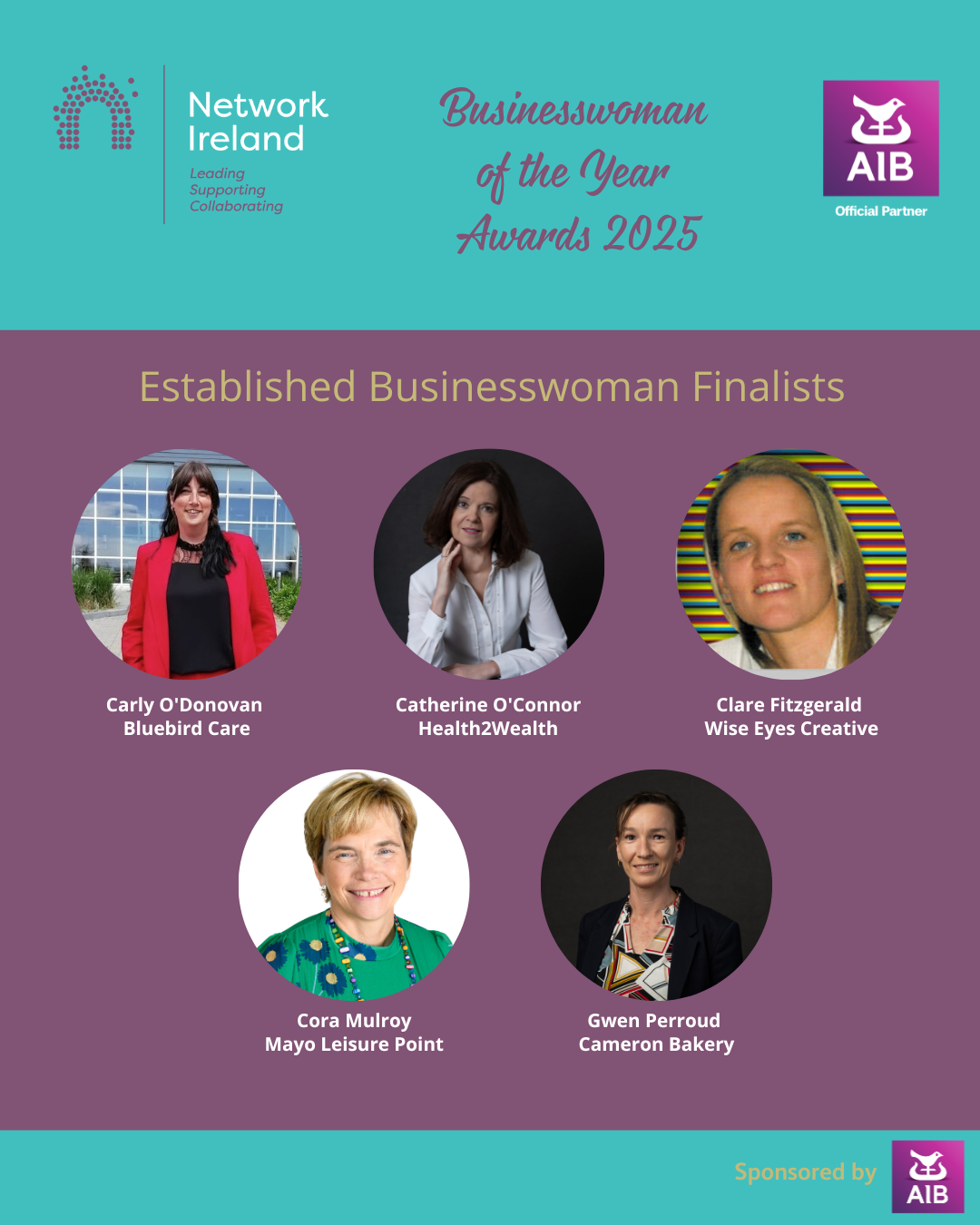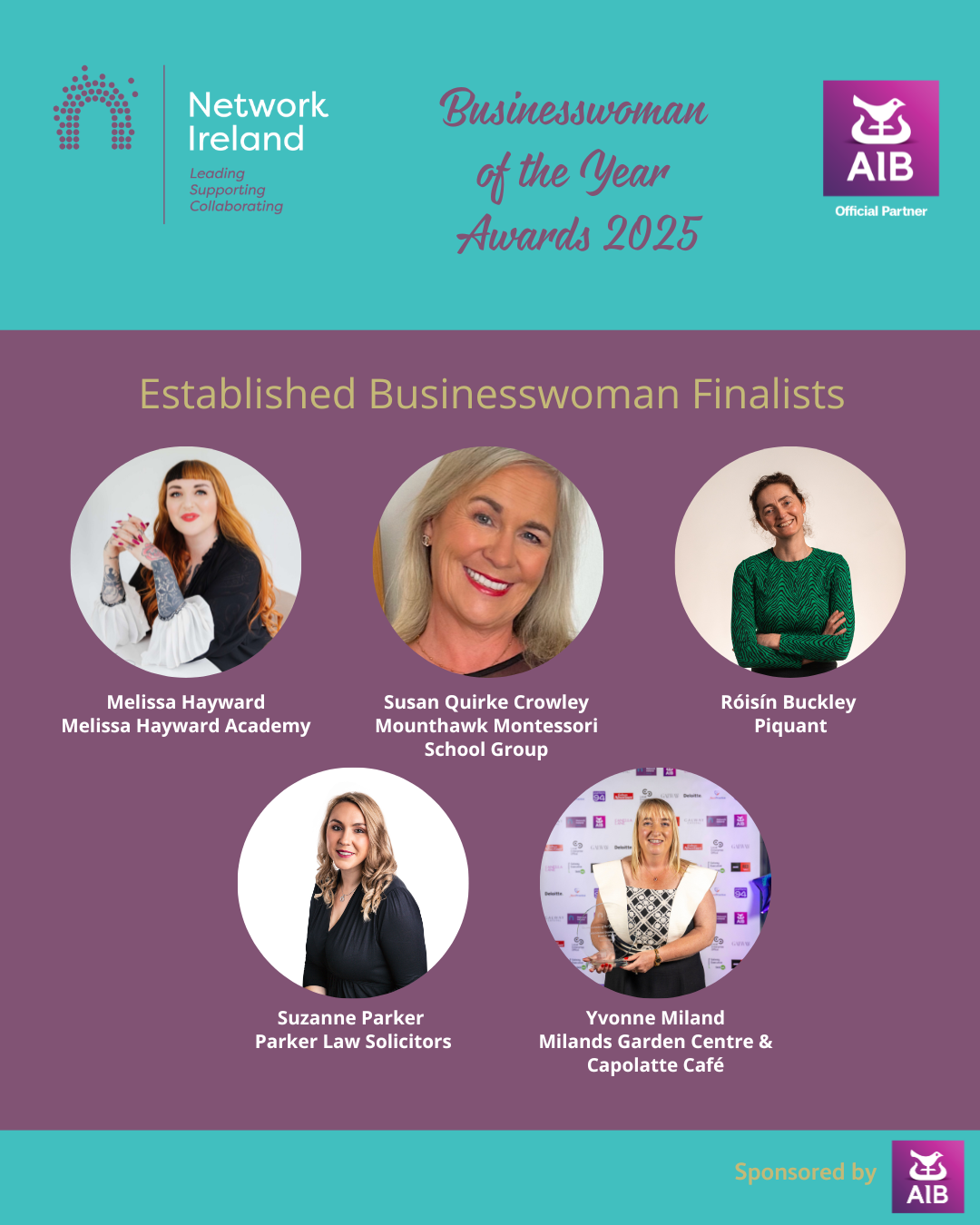 Established BusinesswomanSponsored by AIB This category is to recognise professional Women who have been operating/running a business and trading for 3 years or more. They must employ 2 or more employees. The business entity can operate as a sole trader/partnership or limited company. These women will be able to show the impact that they create running their business. Our 2025 Finalists